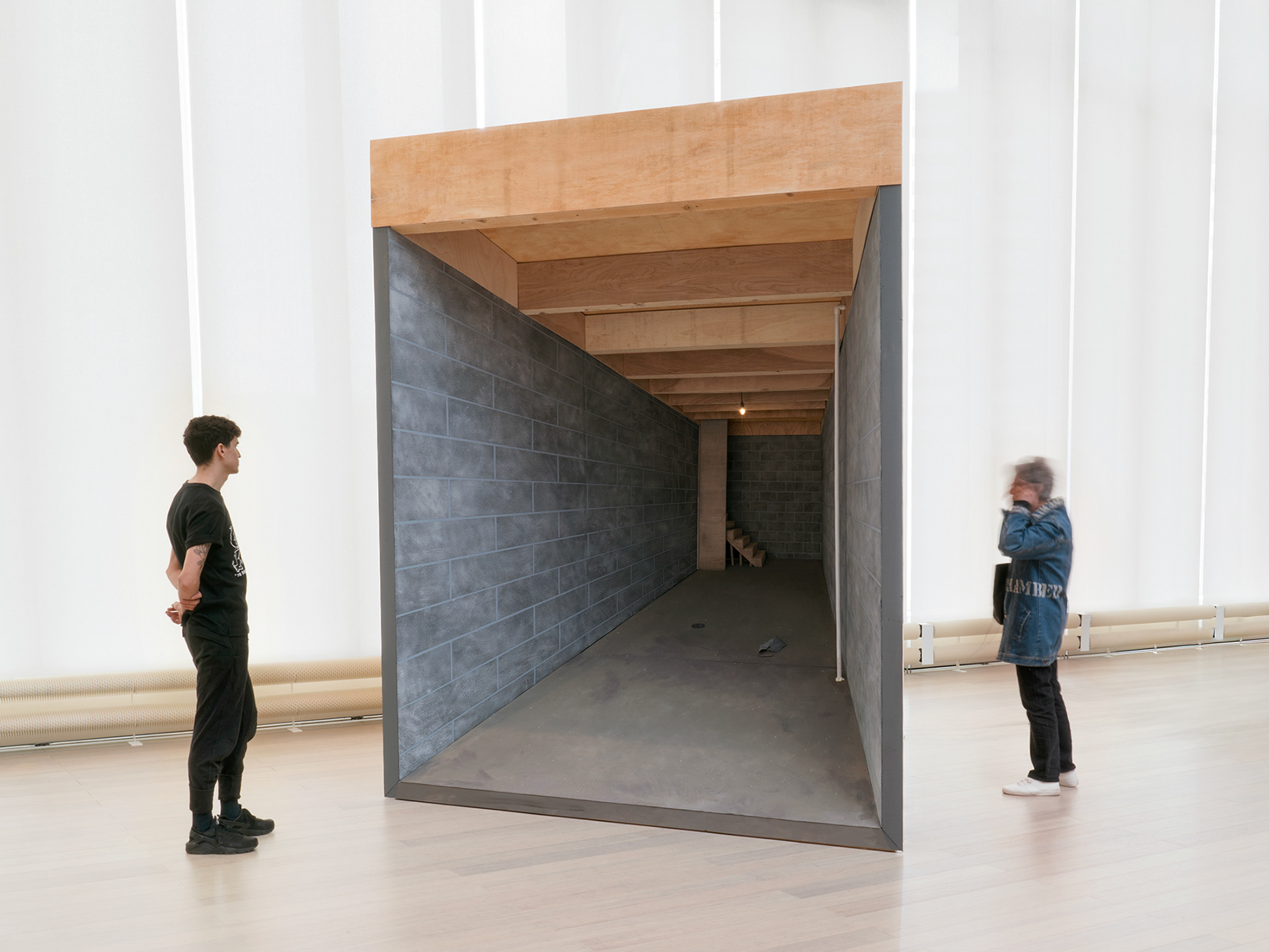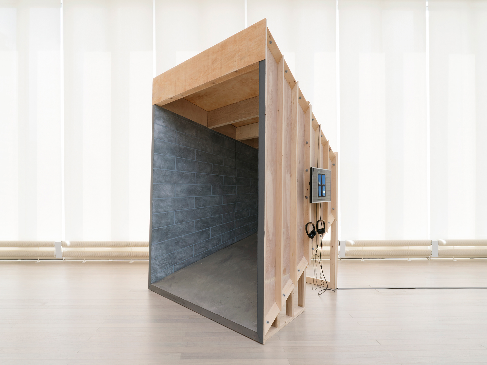 Silver Bullet Test Site is model of a nondescript basement shelter, transforming from full-scale to miniature in a one-point perspective. It is built as a collapsible set that separates into individual painting frames, giving it the impression of being in flux. The sculpture has a video monitor on the exterior, showing a short film of an idyllic desert landscape, native flora and fauna, and unsuspecting buildings.