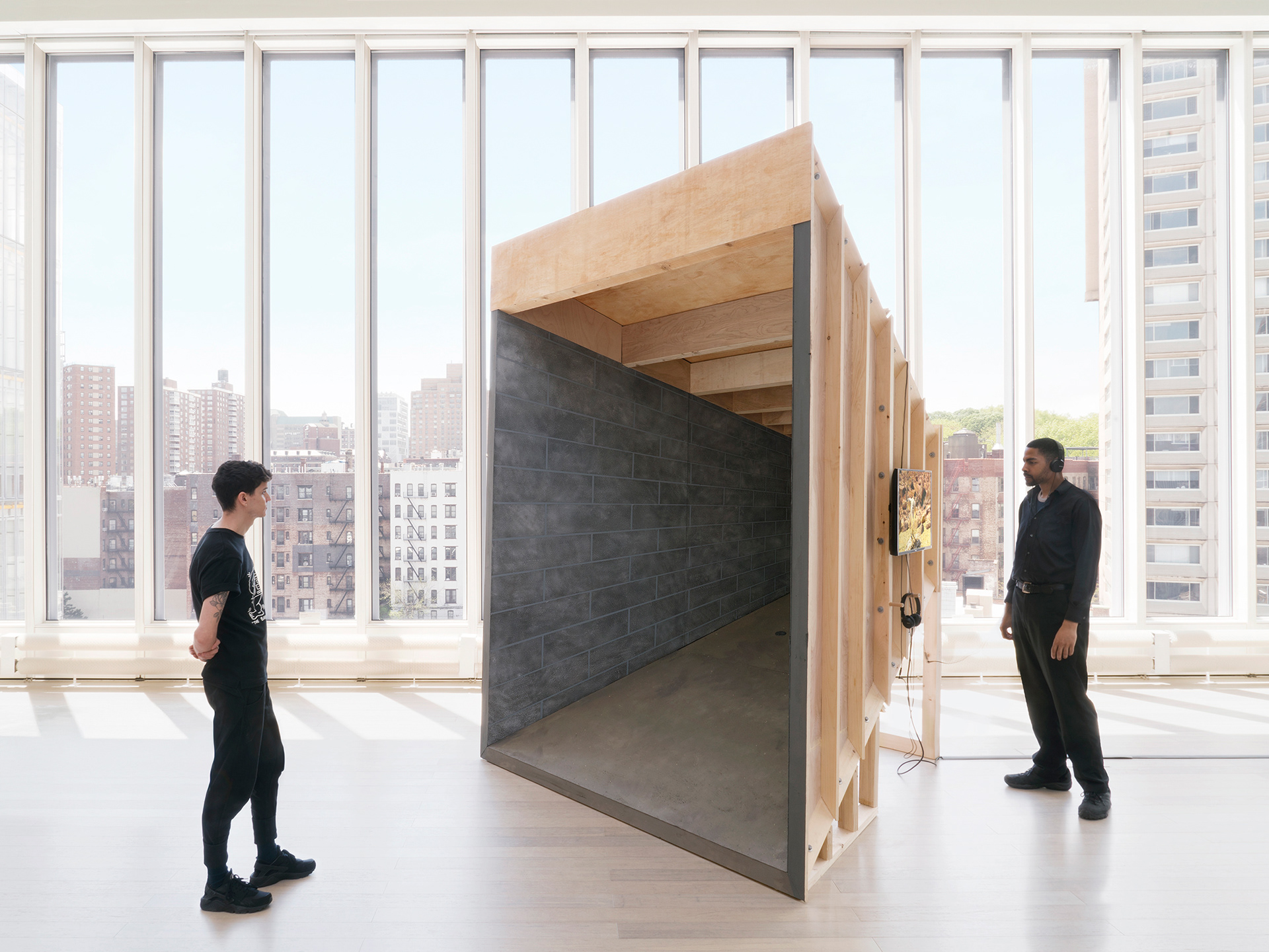 Installation: wood, bolts, house-paint, ceramic, miniature light, PVC, insulation foam, dirt/trash, HD video. Dimensions: 120 x 96 x 96 inches. Photo by Jackie Furtado