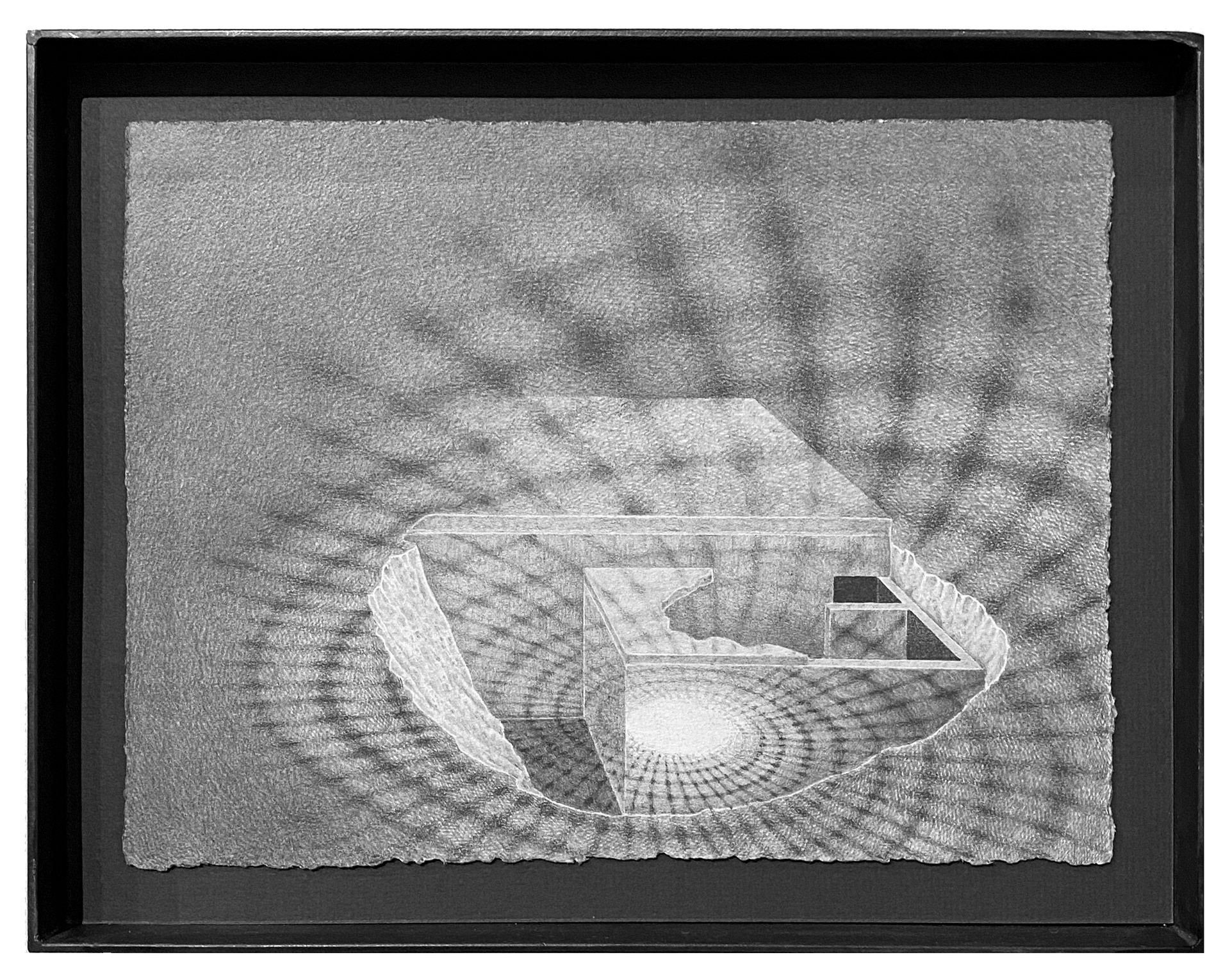 Rendered in dense graphite and rigorous cross-hatching, Stages of Fallout oscillates between presence and absence, as depictions of fallout shelters melt and often explode into optical illusion and celestial settings. Presented as a constellation of steel framed graphite works, they wind around the walls of the Java Project - melding paper and steel. With Stages of Fallout, Rose explores how architectural space can paradoxically lend to feelings of safety and horror – an uncanny state of being.